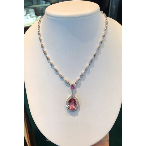 Oval morganite at 16.85 carats, pear shaped pink sapphire at 1.27 carats, Diamonds at 1.15 carats total weight. 18 karat white gold.