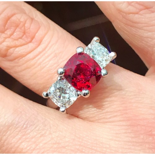 One ladies Tahoe Creations Online design paltinum, ruby, and diamond ring. One cushion cut natural Burmese cushion shaped ruby at 3.01 carats is set in the center of two cushion cut diamonds with the total carat weight of 2.02. G SI1.