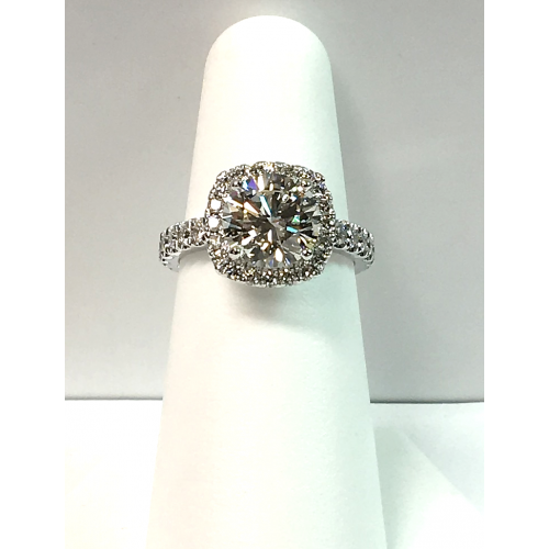 18 karat palladium white gold and diamond engagment ring. One round brilliant cut diamond is set in the center of the ring with four prongs. 2.33 carat round brilliant diamond. Twenty round brilliant cut diamonds are set with four prongs each in the cushion shaped halo top of the ring. Fourteen round brilliant cut diamonds are set with four prings each in the shank of the ring, seven on each side.