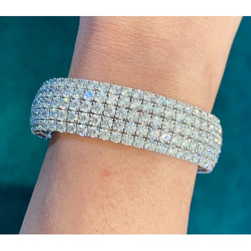 18 karat white gold diamond bangle. 279 round brilliant diamonds are set shared prong style in five rows aournd the bangle.