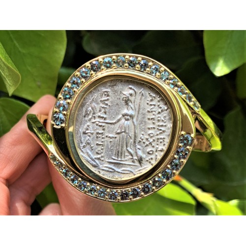 Product Code: 18 karat yellow gold Athena coin/Alexandrite bangle